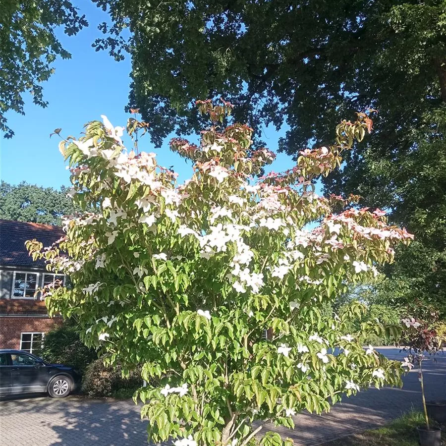 Der Chinesische Blumen-Hartriegel ist die reine Lust für das Gärtnerauge. Er beginnt seinen fulminanten Auftritt mit den fernöstlich inspirierten weißen Blüten im Mai und beendet ihn im Herbst mit scharlachrotem Laub. Damit nicht genug, schmückt er seine 4 Meter Lebensgröße noch mit rosaroten Beeren, so dass man ihn garantiert nicht mehr übersehen kann. Ein Prachtstück ersten Ranges!