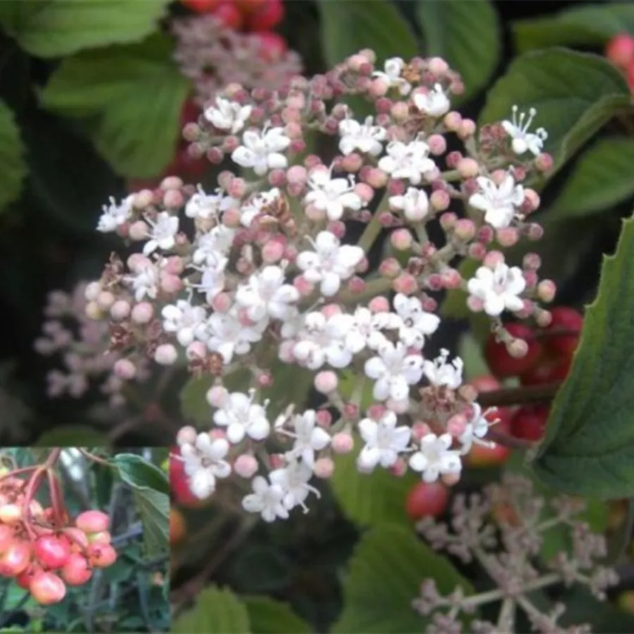 Der Raublütiger Schneeball (Viburnum dasyanthum) eine buschige, aufrechte Gartenpflanze, die, je nach Sorte, Blüten in verschiedenen Farben hervorbringt.
