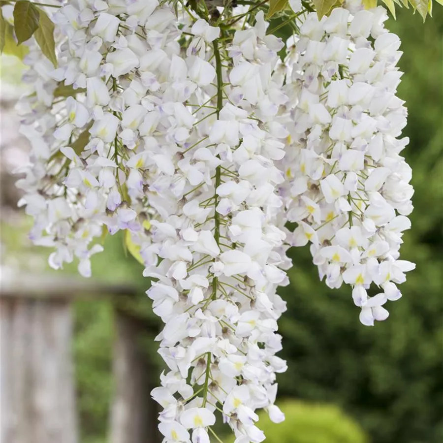 Der Weiße Blauregen 'Alba' bildet weiße, duftende Blüten von Mai bis Juni. Anordnung der Blüten in schönen Trauben.