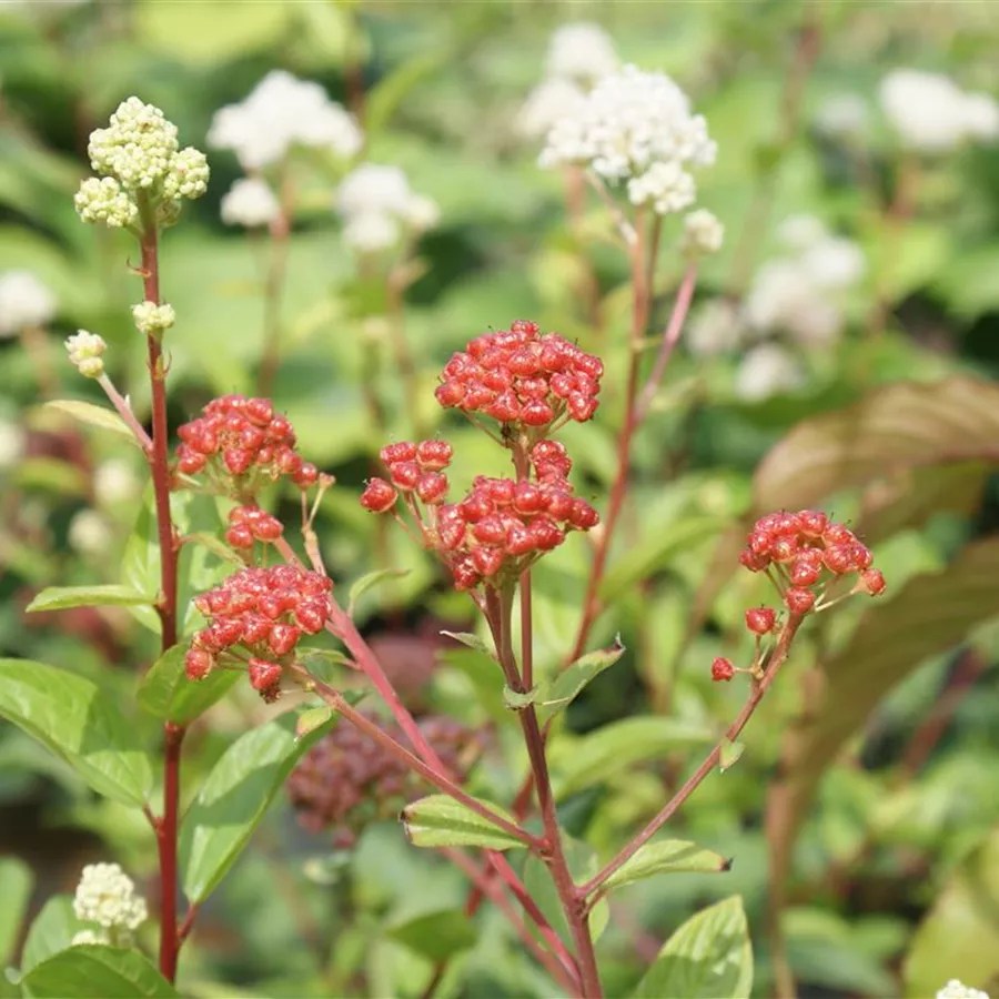 Die Amerikanische Säckelblume (Ceanothus americanus) blüht von Mai bis Juli mit weißen, duftenden Blüten. Ihre Blätter besitzen eine schöne mittelgrüne Farbe. Dieses kompakt, strauchartig wachsende Laubgehölz erreicht eine Höhe von ca. 1,2 m und eine Breite von ca. 1,2 m. Die Amerikanische Säckelblume ist an geschützten Standorten gut frostverträglich.