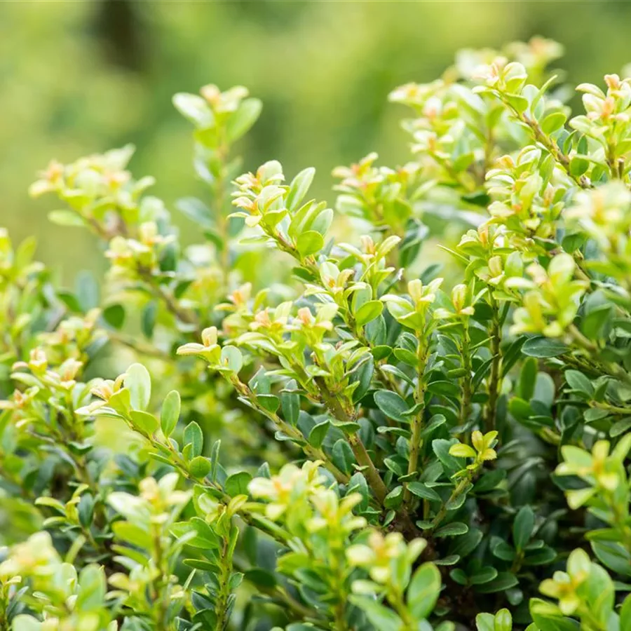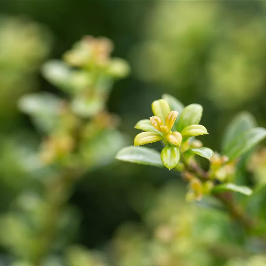 Der Berg-Ilex (Ilex crenata) ist ein gedrungener Strauch mit dekorativen, schwarzen Früchten, die sehr lange haften. Die cremeweißen Blüten erscheinen von Mai bis Juni.