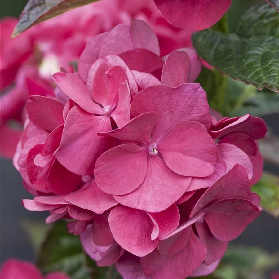 Die purpurroten, schalenförmigen Blüten der Bauernhortensie 'Merveille Sanguine' erscheinen in Dolden von Juni bis September.