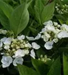 Die sommergrünen Blätter der Tellerhortensie 'Teller White' / 'Libelle' sind mittelgrün, eiförmig, gesägt.