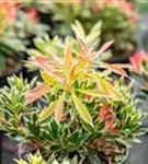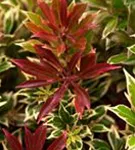 Das Schattenglöckchen 'Flaming Silver' (Pieris japonica) ist ein buschiger, breiter, Kleinstrauch mit dekorativen immergrünen, glänzenden, lanzettlichen, dunkelgrünen Blättern mit einem weißen Rand. Auch der rote Austrieb ist sehr schön.
