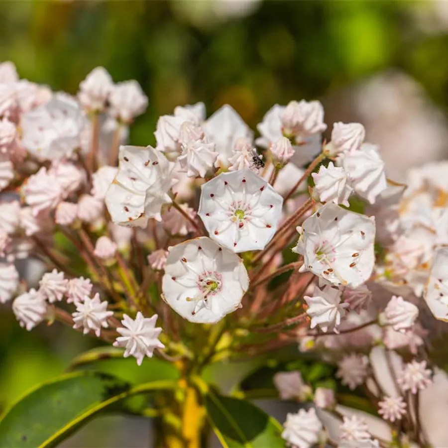 Die hellrosafarbenen, schalenförmigen Blüten des Weißblühenden Berglorbeer 'Elf' erscheinen in Doldentrauben von Mai bis Juni.