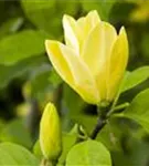 Die sommergrünen Blätter der Magnolie 'Daphne' sind mittelgrün, eiförmig, glänzend. Magnolie 'Daphne' zeigt sich leuchtend braun-gelb im Herbst.