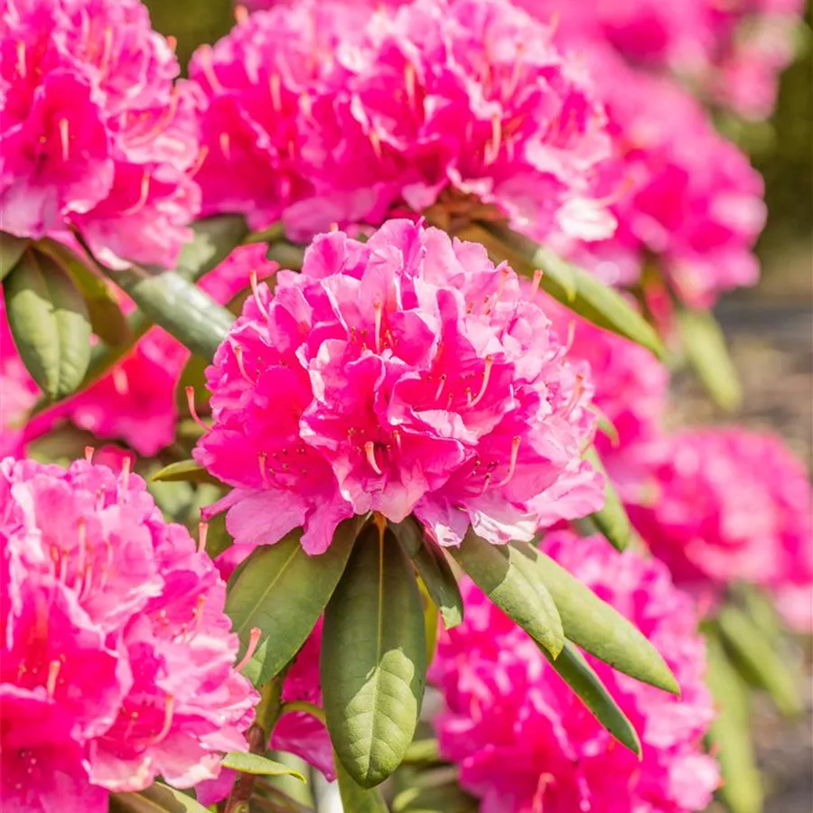 Rhododendron 'Catharine van Tol' bildet von Ende Mai bis Mitte Juni zahlreiche trichterförmige, in Dolden angeordnete, rosafarbene Blüten mit gelbgrüner Zeichnung.