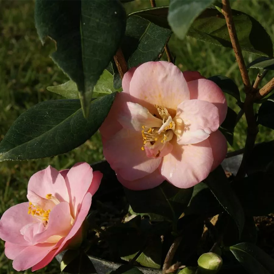Camellia japonica 'Berenice Boddy' bildet während der gesamten Saison zahlreiche rosafarbene Blüten.