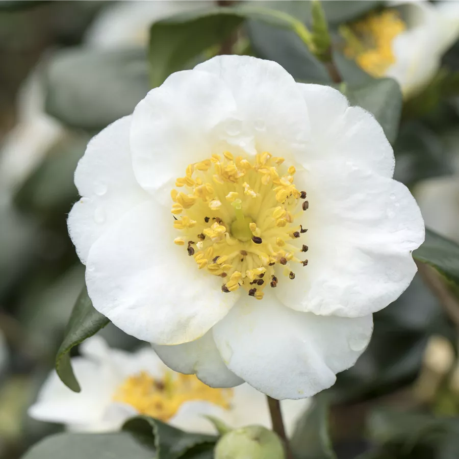 Camellia sinensis bildet weiße Blüten ab Oktober.