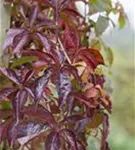Seine gefingerten Blätter sind dunkelgrün. Im Herbst verfärben sie sich prächtig scharlachrot.